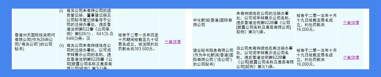 因近期部分香港公司收到注冊(cè)署檢查,未曾在注冊(cè)地掛水牌的信件,并需要在規(guī)定時(shí)間內(nèi)掛上水牌,如不及時(shí)掛水牌有可能會(huì)收到法院傳票及罰款! (附圖為:香港公司注冊(cè)處>檢控個(gè)案概要)